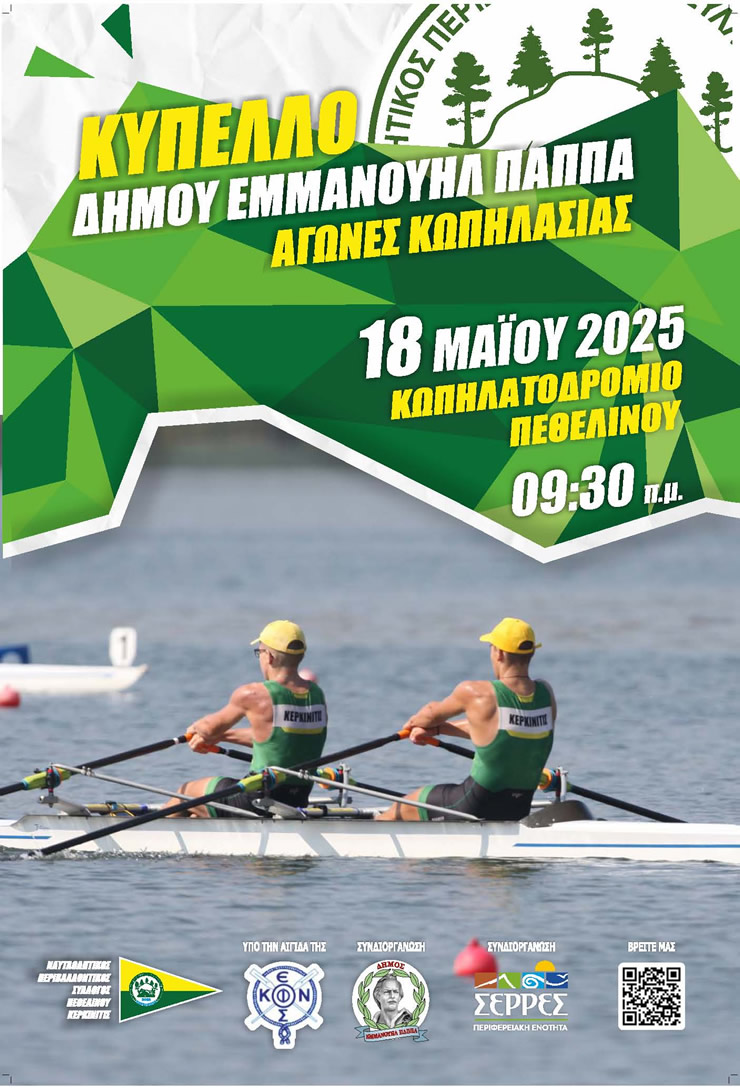 Ο Ναυταθλητικός Περιβαλλοντικός Σύλλογος Πεθελινού «ΚΕΡΚΙΝΙΤΙΣ», με τον Δήμο Εμμανουήλ Παππά, υπό την αιγίδα της Ελληνικής Κωπηλατικής Ομοσπονδίας, συνδιοργανώνουν αγώνες κωπηλασίας με την επωνυμία «ΚΥΠΕΛΛΟ ΔΗΜΟΥ ΕΜΜΑΝΟΥΗΛ ΠΑΠΠΑ».