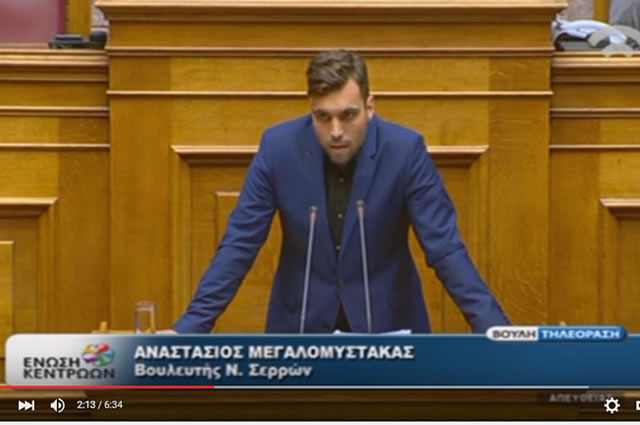Ο Σερραίος Βουλευτής της Ένωσης Κεντρώων Αναστάσιος Μεγαλομύστακας ανέβηκε στο βήμα της Βουλής στη συζήτηση επί των Προγραμματικών Δηλώσεων της Κυβέρνησης.Εμείς το συγχαίρουμε για το θάρρος του και να συνεχίσει έτσι!