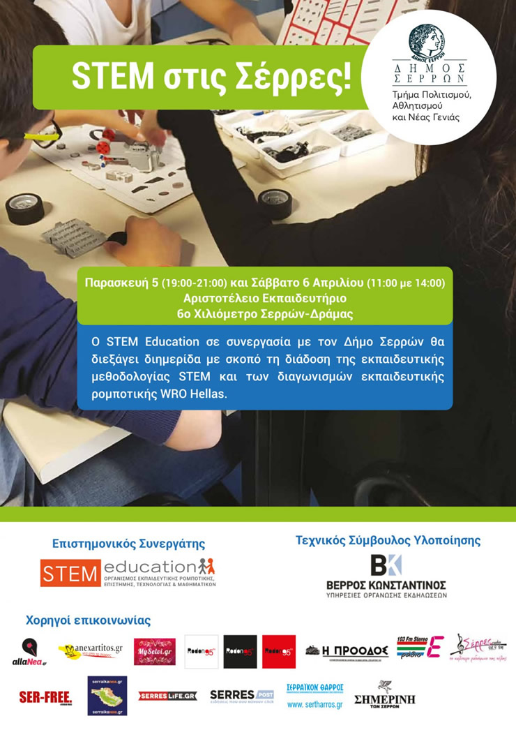 O STEM Education σε συνεργασία με τον Δήμο Σερρών θα διεξάγει διημερίδα με σκοπό τη διάδοση της εκπαιδευτικής μεθοδολογίας STEM και των διαγωνισμών εκπαιδευτικής ρομποτικής WRO Hellas, την Παρασκευή 5 Απριλίου (19.00-21.00) και το Σάββατο 6 Απριλίου (11.00-14.00), στο Αριστοτέλειο Εκπαιδευτήριο (6ο χλμ Σερρών-Δράμας).