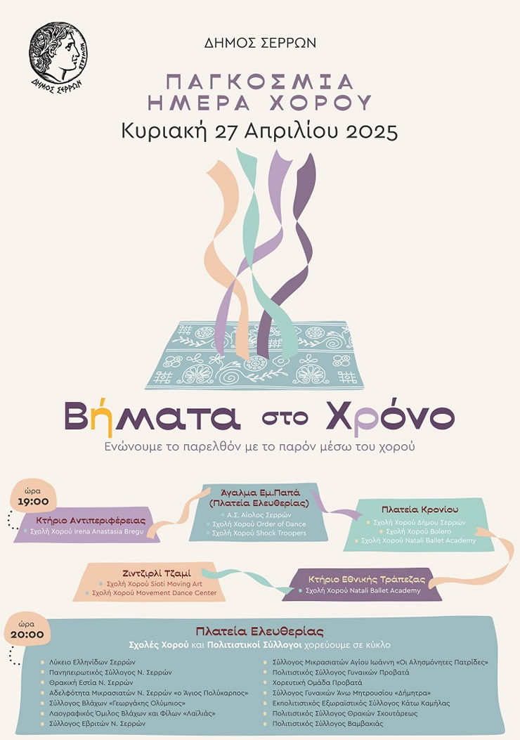 Την Παγκόσμια Ημέρα Χορού θα γιορτάσει ο Δήμος Σερρών, την Κυριακή 27 Απριλίου 2025, με τη συμμετοχή δέκα σχολών χορού και δεκατριών πολιτιστικών συλλόγων.