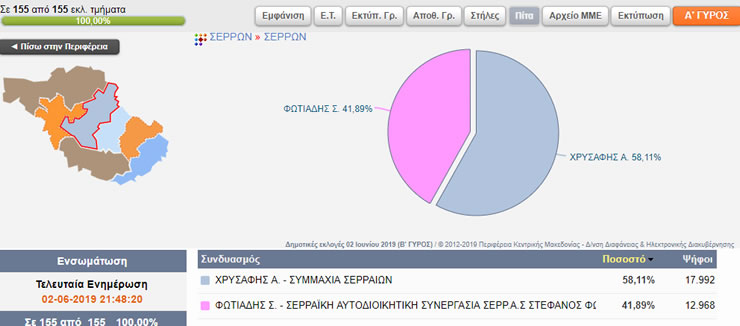 Ο κ. Αλ. Χρυσάφης, με ποσοστό 58,11%, αναδείχθηκε νέος δήμαρχος Σερρών, στο δεύτερο γύρο των εκλογών στο Δήμο Σερρών, ενώ ο κ. Στ. Φωτιάδης, συγκέντρωσε το 41,89% των ψήφων. Σημαντική ήταν η αποχή που έφθασε στο 57,31%.