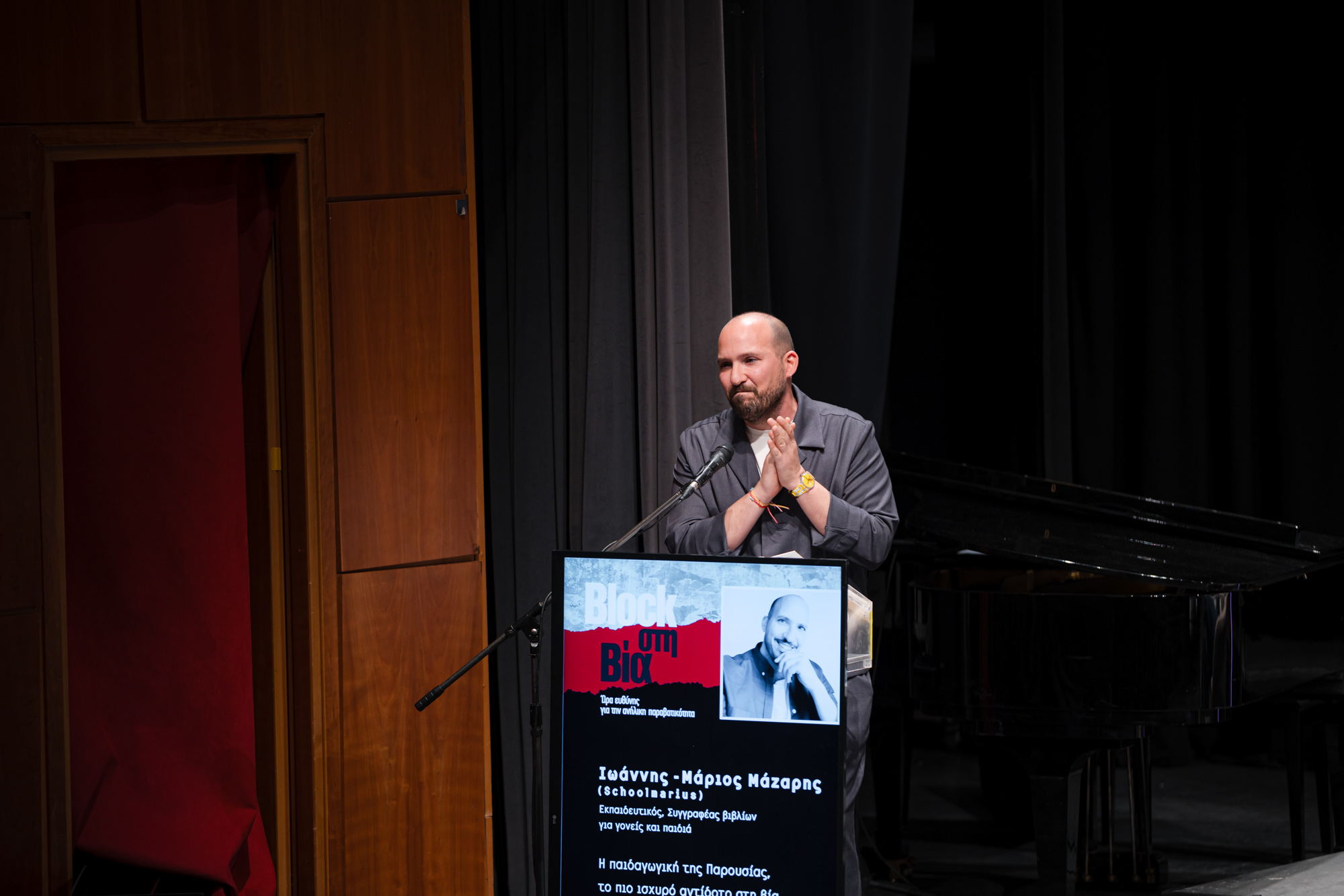 Την αντικατάσταση της οθόνης του κινητού με μια αγκαλιά πρότεινε στην ομιλία του με θέμα: «Η παιδαγωγική της Παρουσίας, το πιο ισχυρό αντίδοτο στη βία» ο Εκπαιδευτικός, Συγγραφέας βιβλίων για γονείς και παιδιά κ. Ιωάννης- Μάριος Μάζαρης (Schoolmarius), τονίζοντας πως μέσα από τα social media κανονικοποιείται η βία, γιατί τα παιδιά την «καταναλώνουν» ασταμάτητα, φτάνοντας σε σημείο να την θεωρούν «φυσιολογική».