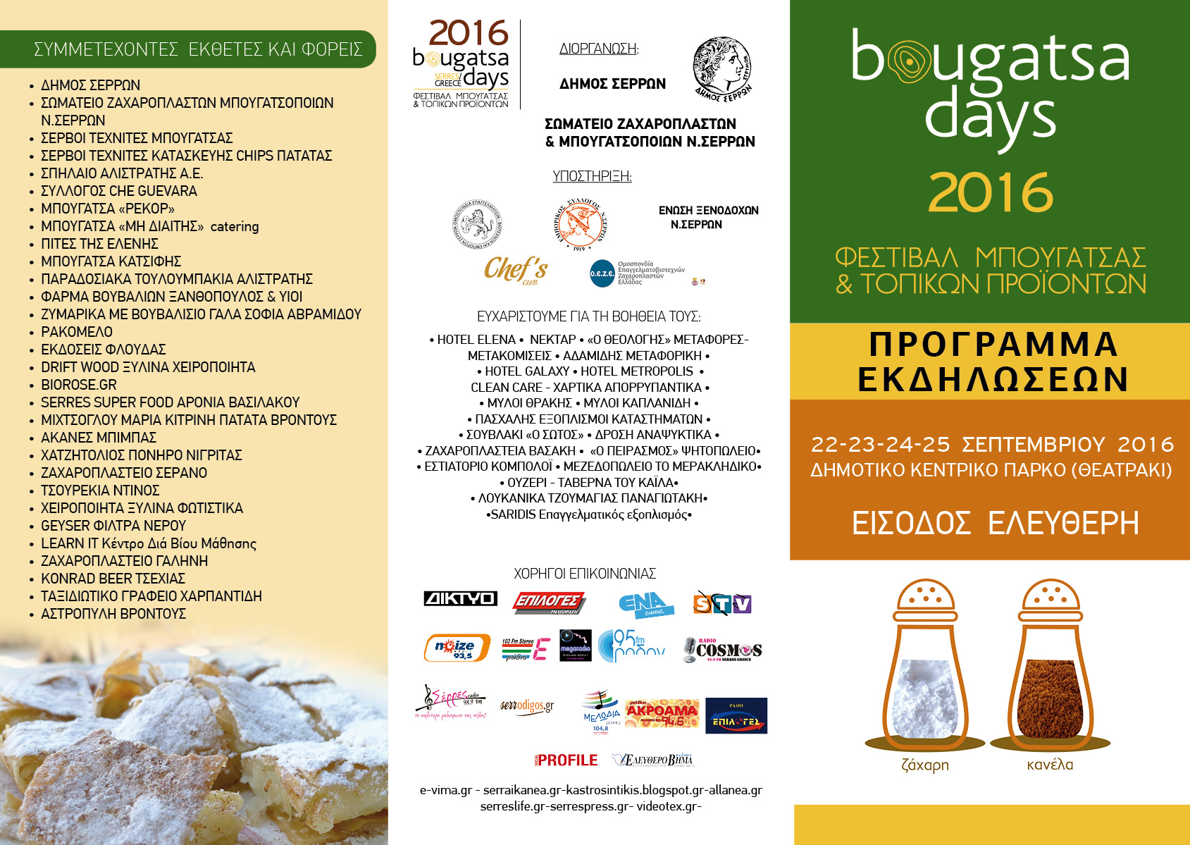 Ένα τετραήμερο όλο γλύκα, πασπαλισμένο με μπόλικη άχνη και κανέλα, ξεκινησε χθες, Πέμπτη μέχρι και την Κυριακή 25 Σεπτεμβρίου, στο δημοτικό κεντρικό πάρκο (θεατράκι) των Σερρών. Πρόκειται για το Φεστιβάλ Μπουγάτσας και Τοπικών Προϊόντων «Bougatsa Days 2016» που διοργανώνει ο Δήμος Σερρών σε συνεργασία με το Σωματείο Ζαχαροπλαστών και Μπουγατσοποιών του νομού.Το παρών θα δώσουν δεκάδες εκθέτες και αρχιμάγειρες που θα συμμετέχουν στο τετραήμερο φεστιβάλ θα παρουσιάσουν την τεχνική της παραδοσιακής μπουγάτσας.