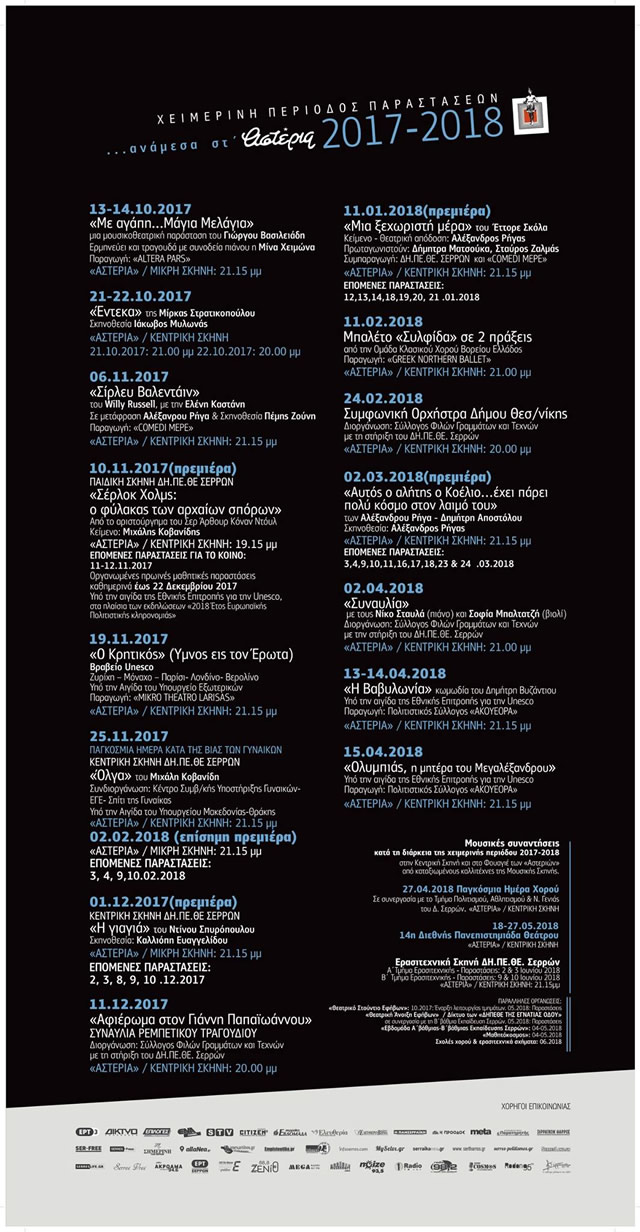 16. ΜΟΥΣΙΚΕΣ ΣΥΝΑΝΤΗΣΕΙΣ στην Κεντρική Σκηνή και στο Φουαγιέ των «Αστεριών» κατά την διάρκεια της Χειμερινής Περιόδου 2017 – 2018 από καταξιωμένους καλλιτέχνες της Μουσικής Σκηνής.
