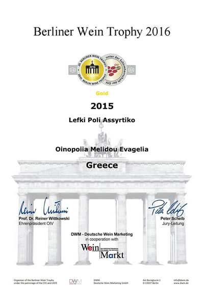 Το πρώτο βραβείο σε Φεστιβάλ που πραγματοποιήθηκε στο Βερολίνο κατέκτησε το σερραϊκό ασύρτικο “Λευκή Πόλη” της Οινοποιϊας Μελίδου.