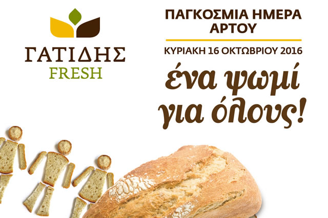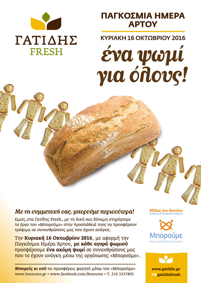Την Κυριακή 16 Οκτωβρίου 2016, με αφορμή την Παγκόσμια Ημέρα Άρτου υλοποιούμε την ενέργεια «Ένα ψωμί για όλους». Με κάθε αγορά ψωμιού από τα καταστήματα Γατίδης Fresh, προσφέρουμε ένα ακόμη ψωμί σε συνανθρώπους μας που το έχουν ανάγκη, μέσω της οργάνωσης "Μπορούμε".