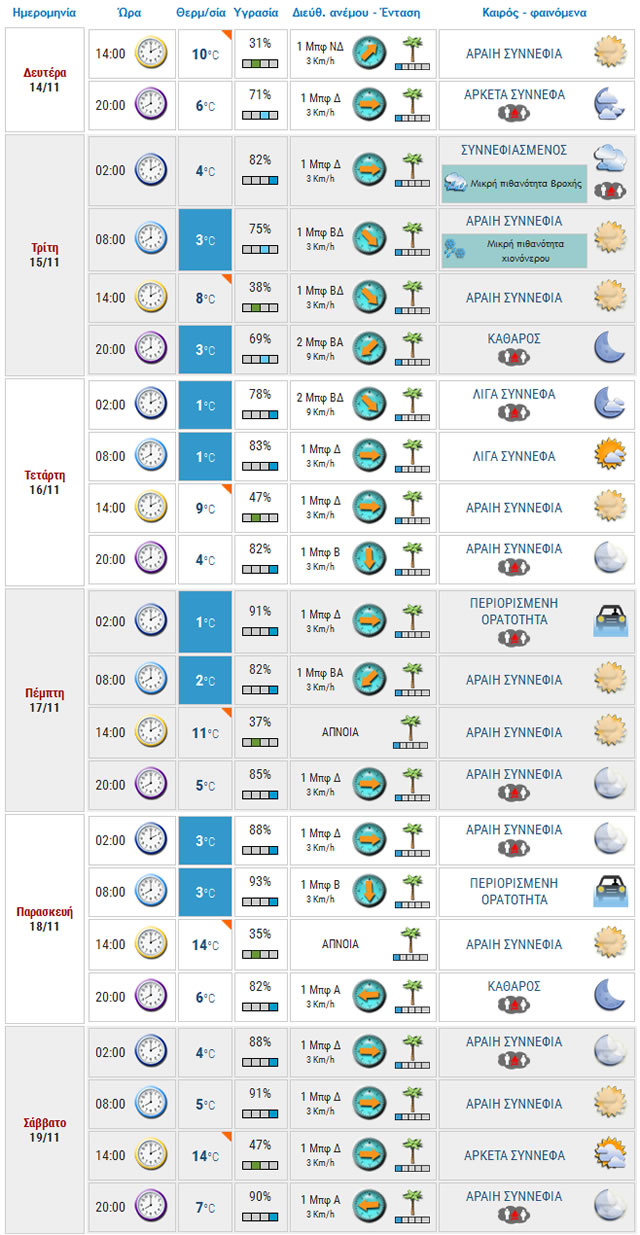 Για αύριο Τρίτη 15/11, προβλέπεται καλός καιρός με αραιή συννεφιά, με τη θερμοκρασία να κυμαίνεται από 3 έως 8 βαθμούς Κελσίου και άπνοια. Μετά το μεσημέρι της ίδιας ημέρας προβλέπεται μεταβολή του καιρού, με καθαρό ουρανό, με το θερμόμετρο να φτάνει τους 3 βαθμούς Κελσίου και μικρή ενίσχυση των ανέμων, από βορειοανατολική κατεύθυνση και ένταση μέχρι 2 μποφόρ.