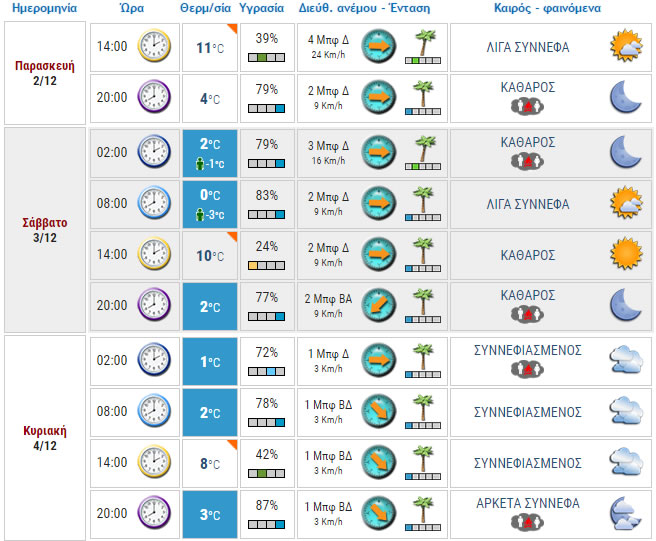 Για αύριο Κυριακή 4/12, ο ουρανός θα είναι συννεφιασμένος, με τη θερμοκρασία να κυμαίνεται από 0 έως 7 βαθμούς Κελσίου και άπνοια. Μετά το μεσημέρι της ίδιας ημέρας θα επικρατήσουν οι ίδιες συνθήκες, με αρκετές νεφώσεις, με το θερμόμετρο να φτάνει τους 2 βαθμούς Κελσίου και διατήρηση της άπνοιας.