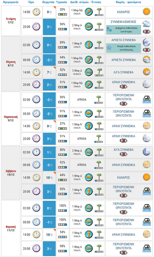 Για αύριο Πέμπτη 8/12, θα υπάρχουν λίγα σύννεφα, με τη θερμοκρασία να κυμαίνεται από -2 έως 7 βαθμούς Κελσίου και ασθενείς δυτικούς ανέμους με ένταση που θα φτάσει τα 3 μποφόρ. Μετά το μεσημέρι της ίδιας ημέρας ο καιρός θα παραμείνει αμετάβλητος, με σποραδική συννεφιά, με θερμοκρασία που θα αγγίξει τους 2 βαθμούς Κελσίου και εξασθένιση των ανέμων σε άπνοια.