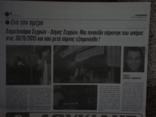 Εάν ισχύει η δεύτερη εκδοχή (δηλαδή εκ παραδρομής), το ζήτημα έχει και συνέχεια. Ακούσαμε πολλάκις διά στόματος του προέδρου του Επιμελητηρίου Σερρών το παράπονο για το τι απέγινε αυτή η πινακίδα, αυτή η πολυπόθητη θέση στάθμευσης. Ως παράπονο; Ως αίτημα; Ως απλή αναφορά; Ακούσαμε δηλαδή από τον κ.Μέγκλα ότι η Δημοτική Αρχή Σερρών οφείλει να μεριμνήσει για θέση πάρκινγκ προς το Επιμελητήριο Σερρών.