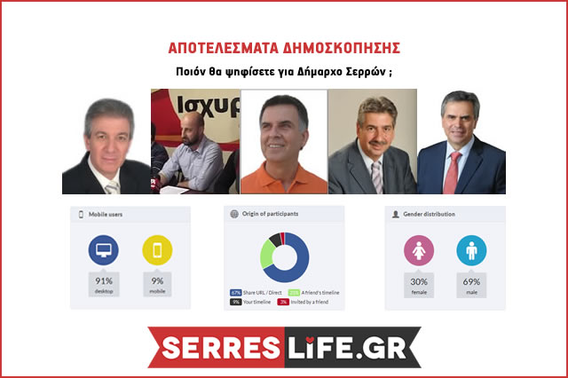 Στις 10:00πμ την Παρασκευή 9 Μαΐου έληξε η Δημοσκόπηση που διοργάνωσε το www.serresLife.gr ως το πιο έγκυρο διαδικτυακό μέσω ενημέρωσης του Ν.Σερρών με τη μεγαλύτερη επισκεψημότητα σε συνεργασία με την εταιρία Super Web Application που ανέλαβε να δημιουργήσει τη Δημοσκόπηση μέσω Facebook.