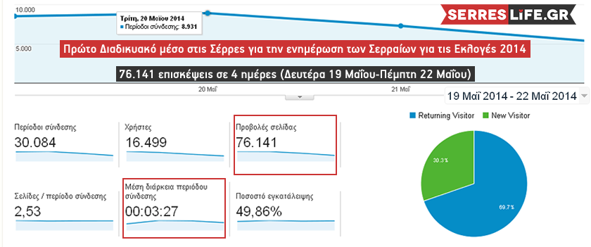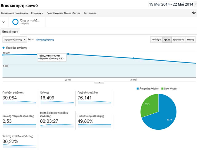 Μέσα σε 4 ημέρες (Δευτέρα 19 Μαΐου-Πέμπτη 22 Μαΐου) είχαμε 76.141 επισκέψεις και ο μέσος όρος επίσκεψης στο site μας ήταν 3:27 λεπτά.