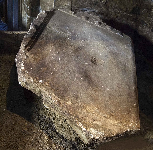 Επίσης, αποκαλύφθηκε το βόρειο τμήμα του μαρμάρινου κατωφλίου, το οποίο έχει συνολικά μήκος 2,15μ. πλάτος 1,6μ. και πάχος 0,25μ. (φωτο 3) Φέρει κυρτές βαθύνσεις, για την ένθεση των μεταλλικών τροχιών που διευκολύνουν την κίνηση των μαρμάρινων θυροφύλλων. Όπως προκύπτει από την συγκεκριμένη τομή, εδώ υπήρχε δάπεδο από πωρόλιθους, που έφεραν λευκό επίχρισμα. Εκατέρωθεν του κατωφλίου εντοπίστηκαν, κατά χώραν, οι πωρόλιθοι του δαπέδου. Στην ανατολική πλευρά της τομής το δάπεδο φαίνεται ότι έχει υποστεί καθίζηση, ενώ δυτικότερα το δάπεδο είναι κατεστραμμένο και οι λίθοι του πεσμένοι στο εσωτερικό της τομής (φωτο 4).
