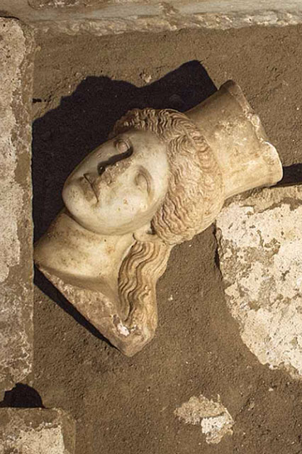 Σε βάθος 0,15μ. από την επιφάνεια του κατωφλίου εντοπίστηκε και αποκαλύφθηκε το μαρμάρινο κεφάλι Σφίγγας. (φωτο 5,6,7,8) Είναι ακέραιο με ελάχιστη θραύση στη μύτη. Έχει ύψος 0,60 μ. Το κεφάλι ταυτίζεται και αποδίδεται στον κορμό της ανατολικής Σφίγγας, όπου ήταν ένθετο. Στρέφεται προς την είσοδο και φέρει πόλο. Στο κάτω μέρος του λαιμού σώζεται ακέραιη η διατομή της έδρασης στο σημείο ένθεσης στον κορμό της. Έχει κυματιστούς βοστρύχους, που φέρουν ίχνη κόκκινου χρώματος, οι οποίοι πέφτουν στον αριστερό ώμο της, ενώ συγκρατούνται από λεπτή ταινία. Πρόκειται για γλυπτό εξαιρετικής τέχνης. Βρέθηκαν, επίσης, θραύσματα από τα φτερά των Σφιγγών.