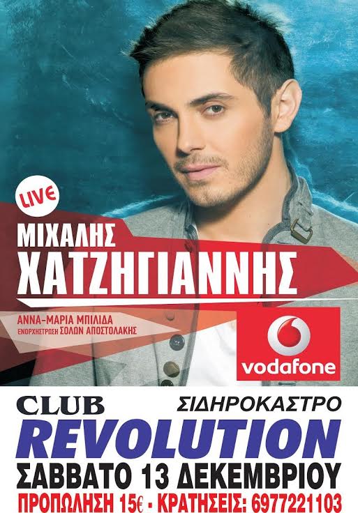 Τις Σέρρες έρχεται να αναστατώσει στις 13 Δεκεμβρίου ο αγαπημένος τραγουδιστής Μιχάλης Χατζηγιάννης για μια ζωντανή εμφάνιση στο Revolution Club στο Σιδηρόκαστρο Σερρών. O ταλαντούχος τραγοδίστης μαζί με όλο του το επιτελείο καθως και την Αννα Μαρία Μπιλίδα απο το The Voice θα προσφέρουν μια αξέχαστη βραδιά με όλες τις αγαπημένες επιτυχίες του τραγουδιστή. Η τιμή εισόδου είναι 18 ευρώ με ποτό ενώ η προπώληση είναι στα 15 ευρώ με ποτό και η τιμή φιάλης στα 90 ευρώ.