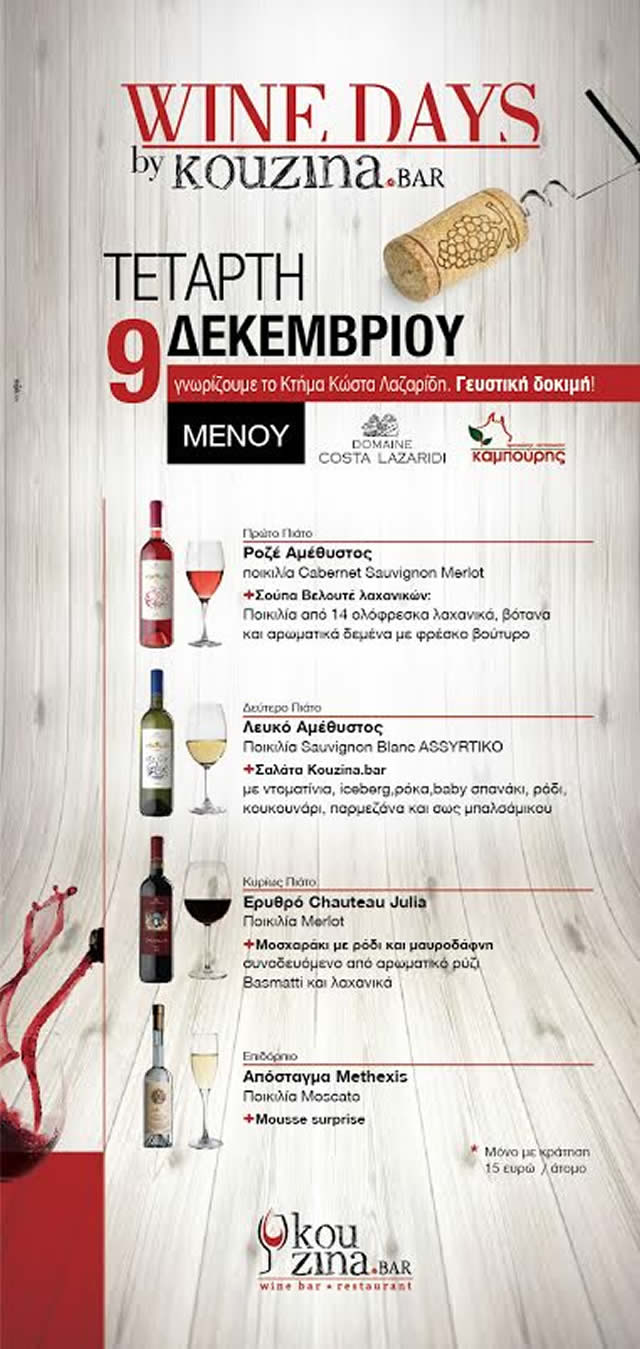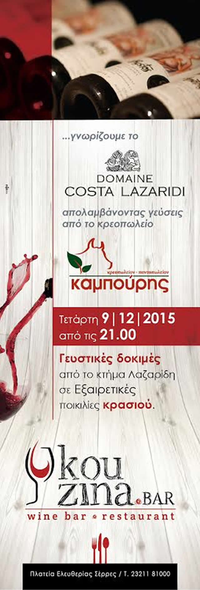 Μετά την επιτυχημένη παρουσίαση του Κτήματος Παυλίδη και του Κτήματος Σώκου που έγιναν στο Kouzina Bar και πολλοί Σερραίοι είχαν την ευκαιρία να δοκιμάσουν τα κρασιά του κτήματος, σειρά έχει την Τετάρτη 9 Δεκεμβρίου η παρουσίαση του COSTA LAZARIDI μαζί με γευστική πρόταση από το Κρεοπωλείο Καμπούρη σε τιμή 15€ το άτομο σύνολο και απαιτείται κράτηση στο 23211 81000