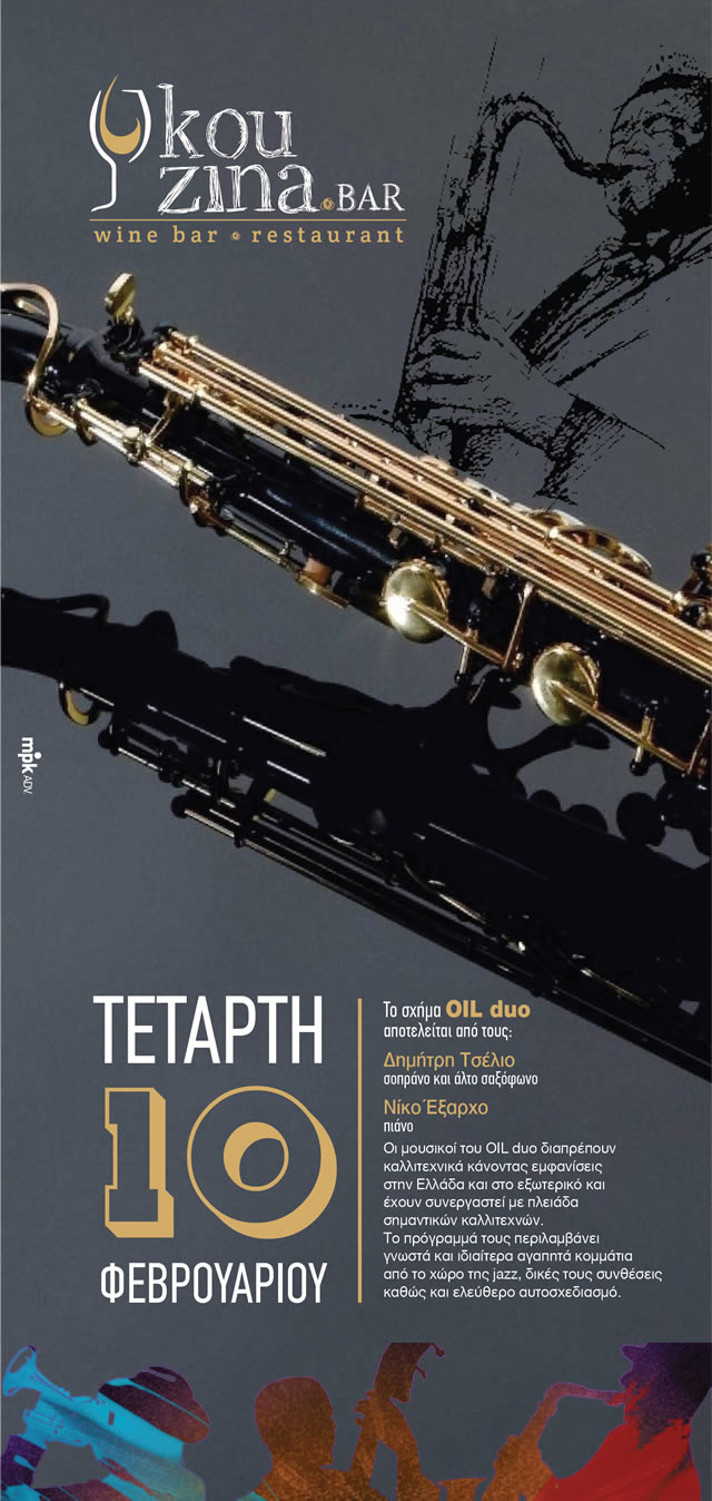 Ήρθε η ώρα να γεμίσουμε και τις Τετάρτες σας..Στο Kouzina Bar την Τετάρτη υποδεχόμαστε live το σχήμα OIL duo για την πρώτη Jazz βραδιά!!