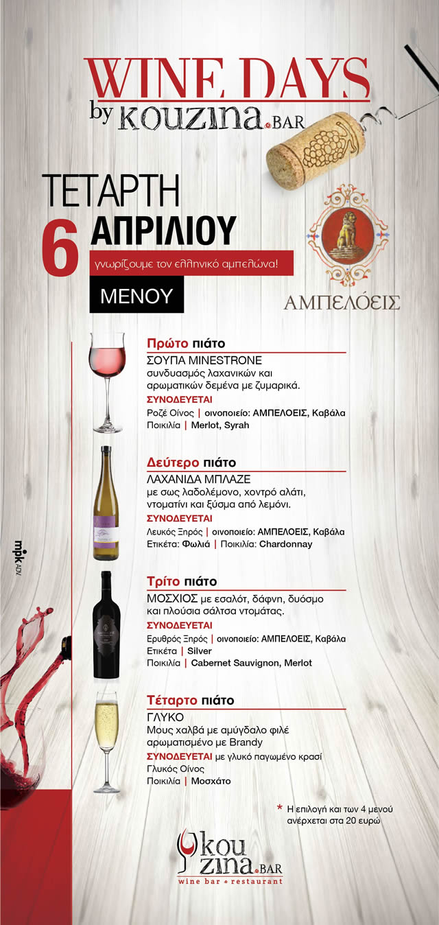 Αυτή την Τετάρτη 6 Απριλίου υποδεχόμαστε εξαιρετικά κρασιά και γνωρίζουμε τον Ελληνικό αμπελώνα Αμπελόεις σε συνδυασμό με γαστρονομικές προτάσεις του chef του Kouzina Bar σε πολύ καλές τιμές και σε ένα περιβάλλον που ξεχωρίζει σε όλα του!