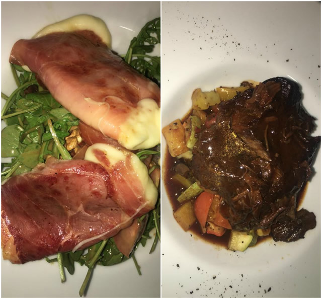 η σαλάτα ήταν ολόφρεσκη και πεντανόστιμη, ενώ η ψητή μοτσαρέλα τυλιγμένη σε φέτες προσούτου την έκαναν άκρως εντυπωσιακή αλλά και χορταστική! Το δε κυρίως πιάτο (μοσχαρίσια μάγουλα)έκανε τον ουρανίσκο και κάθε μας κύτταρο να “χορεύουν” από ευχαρίστηση! Το κρέας έλιωνε στο στόμα αφήνοντας μια μοναδική επίγευση, ενώ τα λαχανικά, έπεισαν ακόμη και αυτούς που δεν τα πολυσυμπαθούν.
