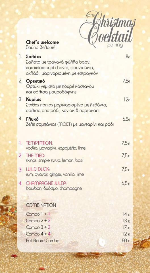 Το Pre-Christmas cocktail pairing μενού του "ΒΟΛΤΑ" είναι ένα χαρούμενο ταξίδι στις γεύσεις τα υλικά, τα χρώματα, τα αρώματα και τις υφές όπως μπορείτε να δείτε και παρακάτω στην κάρτα της ημέρας