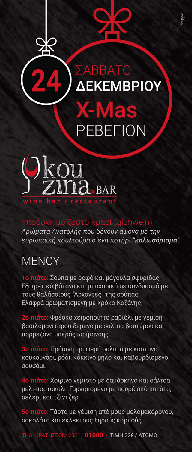 Οι άψογοι οικοδεσπότες του kouzina bar σας υποδέχονται με ζεστό κρασί και σειρά εχει το χριστουγεννιάτικο μενού που θα σας μαγέψει. Κλείστε εγκαίρως τις θέσεις σας,μιας και αρκετές κρατήσεις έχουν ήδη γίνει.