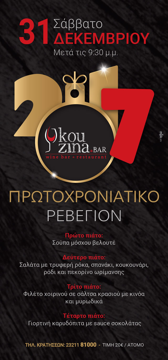 Έτσι, λοιπόν, υποδεχόμαστε το 2017 στην καρδιά της πόλης, σε ένα μαγαζί που λατρεύουμε να επισκεπτόμαστε, παρέα με τα αγαπημένα μας πρόσωπα αλλά και τις γνώριμες φιγούρες των ανθρώπων του Kouzina Bar.