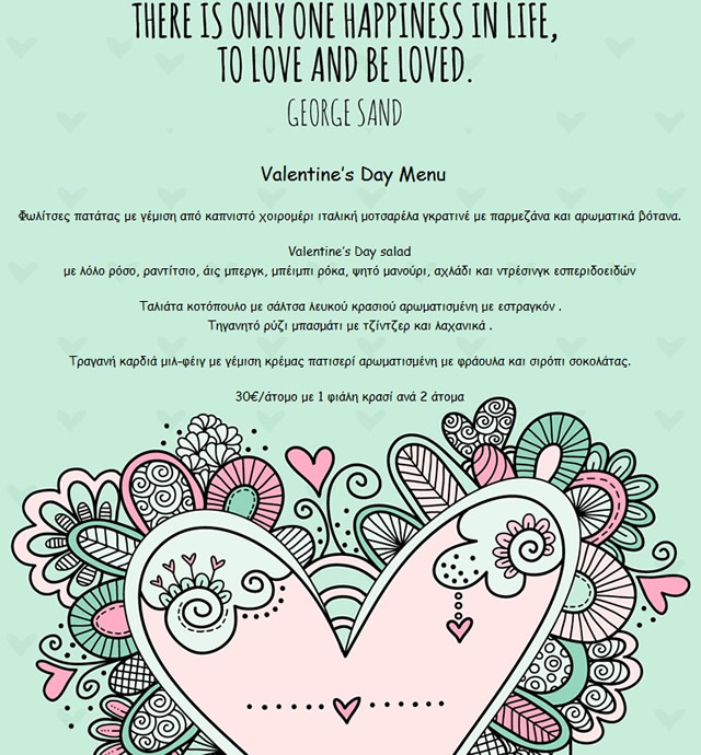 Εκείνη την ημέρα στο εστιατόριο La Vista, στην πιο όμορφη φωνιά της πόλης, στο πιο σύγχρονο ξενοδοχείο της πόλης μας, θα έχουμε τη δυνατότητα να απολαύσουμε ένα μενού ειδικά διαμορφωμένο για ερωτευμένους.