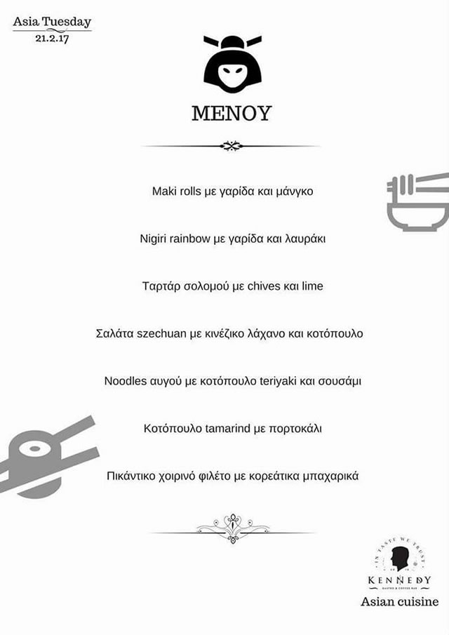 Σήμερα Τρίτη και όπως κάθε Τρίτη του Φεβρουαρίου (πλην της 14ης Φεβρουαρίου), το Kennedy Gastro and Coffee_Bar έχει άρωμα Ασίας. Παραδοσιακά πιάτα της Άπω Ανατολής κάνουν την εμφάνισή τους προσφέροντας κάτι διαφορετικό στην καθημερινότητα των Σερραίων. Το μενού επιμελείται ο γνωστός Executive Chef, Άγγελος Αγγελούδης. (Bill&Coo, Nama, Nammos)