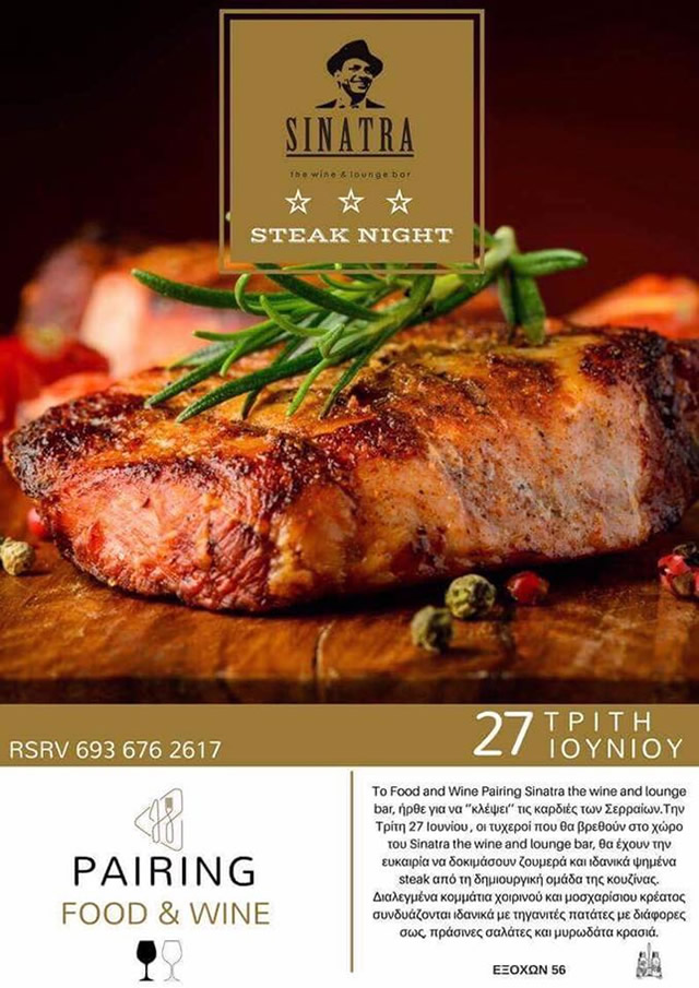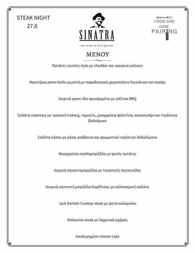 Σήμερα Τρίτη 27 Ιουνίου , οι τυχεροί που θα βρεθούν στο χώρο του #Sinatra_the_wine_and_lounge_bar, θα έχουν την ευκαιρία να δοκιμάσουν ζουμερά και ιδανικά ψημένα #steak από τη δημιουργική ομάδα της κουζίνας μας.
