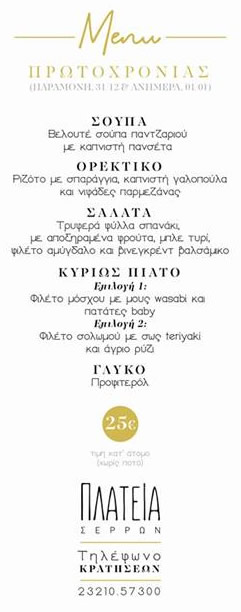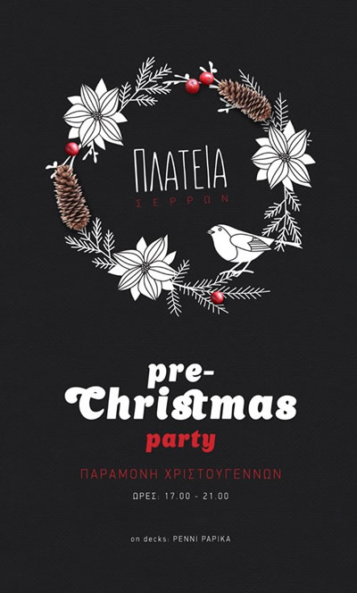 Το κλείσιμο της αγοράς την παραμονή των Χριστουγέννων μας βρίσκει στην Πλατεία, στο πιο ξέφρενο Pre-Christmas party της πόλης με dj της άρτι αφιχθείσα από το νησί της Κέρκυρας Πέννυ Παπίκα που θα μας γεμίσει με ενέργεια για το ρεβεγιόν που θα ακολουθήσει το βράδυ, όπου το μενού είναι κάτι παραπάνω από εκλεπτισμένο και απολαυστικό.
