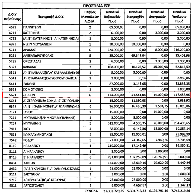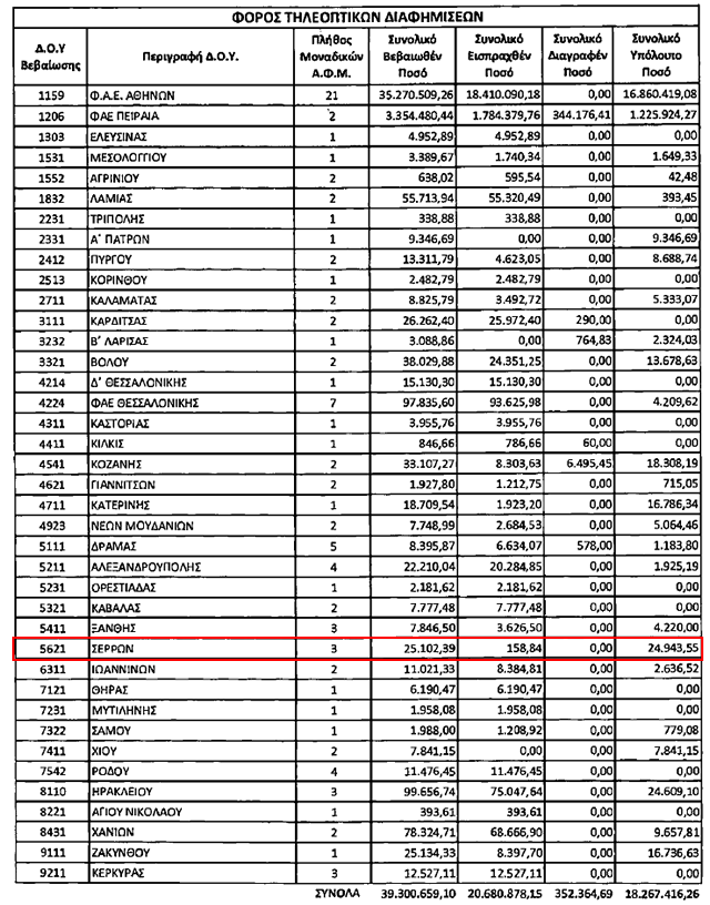 Σύμφωνα με τους πίνακες που βεβαιώθηκαν στις αρμόδιες ΔΟΥ και δόθηκαν στη δημοσιότητα τα χρέη των Σερραϊκών καναλιών από τα πρόστιμα του ΕΣΡ και από το μη αποδομένο φόρο τηλεοπτικών διαφημίσεων ανέρχεται στο ποσό 142.400€.Μπορείτε να δείτε αναλυτικά παρακάτω στους πίνακες τα ποσά που βεβαιώθηκαν, τα ποσά που διαγράφηκαν, πληρώθηκαν και τα ποσά που έχουν μείνει υπόλοιπο.