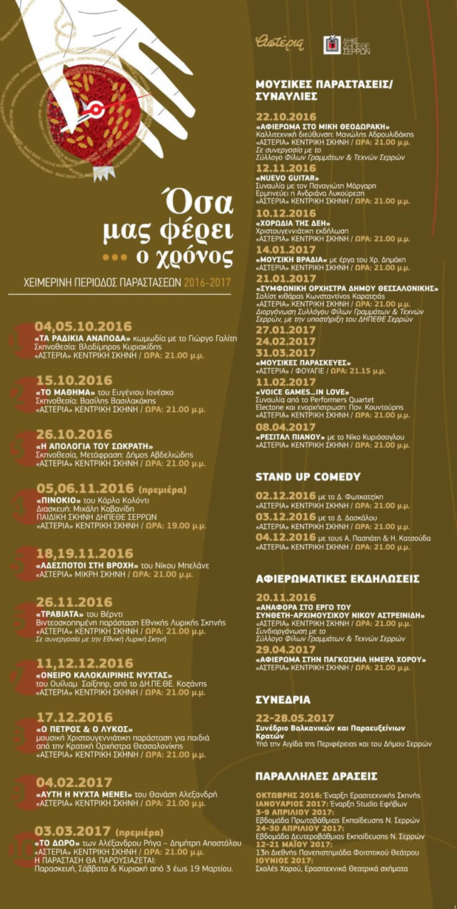 Πλούσιο, ενδιαφέρον και πολυποίκιλο το πρόγραμμα του ΔΗΠΕΘΕ Σερρών για τη χειμερινή περίοδο.Δείτε παρακάτω όλο το χειμερινό Πρόγραμμα του Δημοτικού Θεάτρου Σερρών (ΔΗ.ΠΕ.ΘΕ)
