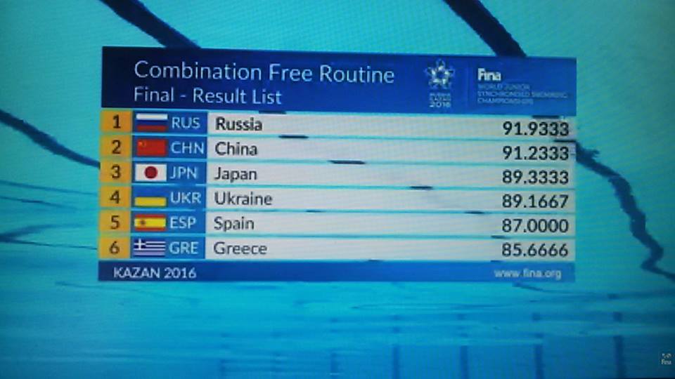 Εξαιρετική όμως ήταν και η εμφάνιση που πραγματοποίησε η Εθνική ομάδα του Κόμπο στον τελικό του Παγκοσμίου Πρωταθλήματος καθώς κατέλαβε την 6η θέση. Η ελληνική ομάδα είχε στη σύνθεση της τις δύο Σερραίες, Αθανασία Τσόλα και Δήμητρα Τσιαντή αλλά και τις Μαρία Ελένη Αρμάου, Ιφιγένεια Δίπλα, Βαλεντίνα Φαραντούρη, Βασιλική Κοφίδη, Όλγα Κουργιαντάκη, Σοφία Eυαγγελία Μαλκογεώργου, Αναστασία Ταξοπούλου, Άννα Μαρία Ταξοπούλου, αναπλ. Θάλεια Παπαδοπούλου και Όλγα Παπασαράντη. Οι Ελληνίδες αθλήτριες εκτέλεσαν ένα εξαιρετικό και μεγάλης δυσκολίας πρόγραμμα και βαθμολογήθηκαν με 85,6666 βαθμούς. Το χρυσό μετάλλιο πήρε η Ρωσία με 91,9333 βαθμούς, ενώ η Κίνα κατέκτησε το ασημένιο μετάλλιο με 91,2333 βαθμούς. Στο τρίτο σκαλί του βάθρου ανέβηκε η Ιαπωνία με 89,8333 βαθμούς.