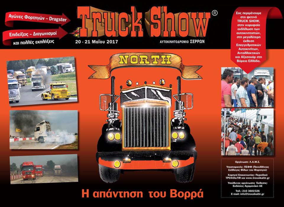 Supertrucks με εξωτερικές βελτιώσεις, εντυπωσιακές αερογραφίες, χλιδάτα εσωτερικά και φυσικά πλούσιο θέαμα αγωνιστικών φορτηγών στο Αυτοκινητοδρόμιο το ερχόμενο Σαββατοκύριακο 20-21 Μαΐου, οπότε και θα πραγματοποιηθεί το Truck Show North που διοργανώνει η Λέσχη Αυτοκινήτου-Μοτοσικλέτας Σερρών με την υποστήριξη του Πανελληνίου Συλλόγου Φίλων Φορτηγού.