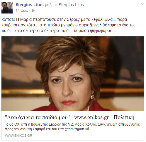 Σκληρή κριτική του Στέργιου Λίτου με δημοσίευσή του στο προσωπικό του λογαριασμό στο Facebook με αφορμή το άρθρο του enikos.gr που αναφέρετε στο 6ο ΟΧΙ που είπε η βουλευτής Σερρών της Ν.Δ Μαρία Κόλλια.