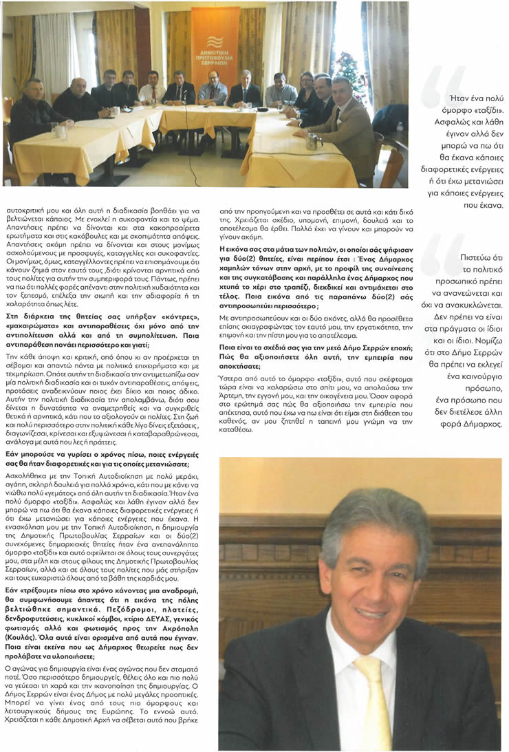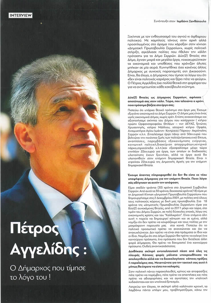 Οι παραπάνω σκέψεις ανήκουν στο Δήμαρχο Σερραίων, Πέτρο Αγγελίδη, ο οποίος μίλησε στο δημοσιογράφο, Ιορδάνη Ξανθόπουλο και το περιοδικό «ΜΕΤΑmagazino».