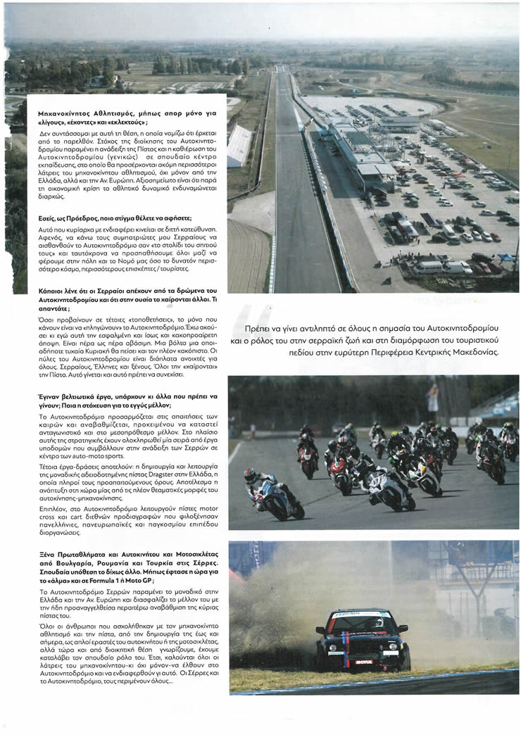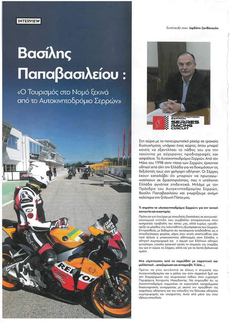 «Πρέπει να γίνει αντιληπτό σε όλους η σημασία του Αυτοκινητοδρομίου και ο ρόλος του στην σερραϊκή ζωή και στη διαμόρφωση του τουριστικού πεδίου στην ευρύτερη Περιφέρεια Κεντρικής Μακεδονίας». Οι παραπάνω σκέψεις ανήκουν στον Πρόεδρο του Αυτοκινητοδρομίου Σερρών, Βασίλη Παπαβασιλείου, ο οποίος μίλησε στο δημοσιογράφο, Ιορδάνη Ξανθόπουλο και το περιοδικό «ΜΕΤΑmagazino».