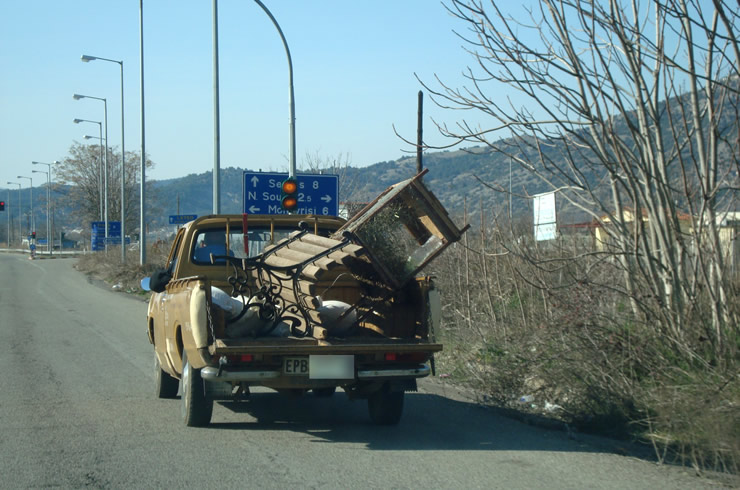 Το αγροτικό αυτοκίνητο με τη φορτωμένη καρότσα κυκλοφορεί και εκτελεί . . . μεταφορές. Στη συγκεκριμένη περίπτωση μεταφέρει στο πίσω μέρος ένα παγκάκι και ακόμη ένα ξύλινο έπιπλο. Τα αντικείμενα έχουν στοιβαχτεί και έχουν δεθεί μάλλον πρόχειρα και μάλιστα προεξέχουν από τα όρια του αμαξώματος, κάτι που σαφώς απαγορεύεται.