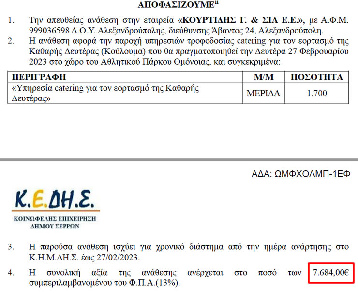 Αυτή η υπηρεσία συνδυαστικά με το κόστος της μας προκαλεί εντύπωση καθώς αυτό το κόστος περιλαμβάνει μόνο την υπηρεσία Catering και μόνο για το Αθλητικό Πάρκο Ομόνοιας καθώς στα χωριά τις κουτάλες έπιασαν οι εθελοντές, οι Πρόεδροι και οι Πολιτιστικοί Σύλλογοι…