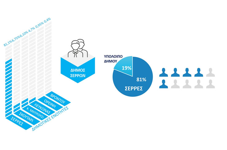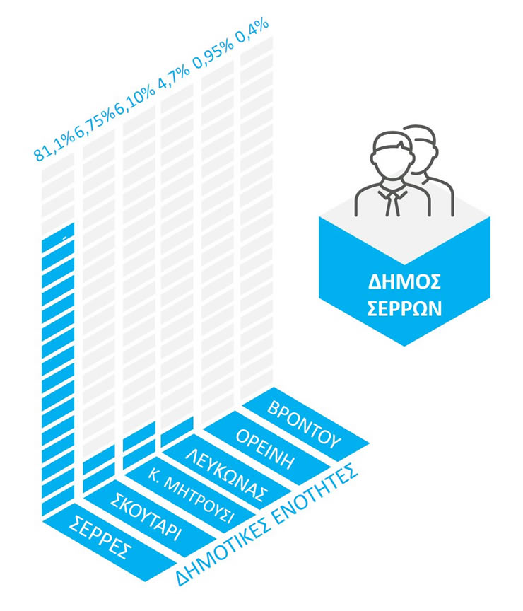 Σύμφωνα με  την ανάλυση  που πραγματοποίησε η  ομάδα εργασίας της Ανεξάρτητης Κίνησης Πολιτών Δήμου Σερρών, Ώρα Ευθύνης – Γιώργος Τσιμερίκας, στη βάση του επίσημου μόνιμου πληθυσμού του Δήμου Σερρών (74.004 μόνιμοι κάτοικοι), η  κατανομή σε επίπεδο Δημοτικών Ενοτήτων θα είναι κατ’ εκτίμηση: Άνω Βροντού >300 κάτοικοι, Καπ. Μητροσίου <4.500 κάτοικοι, Λευκώνα < 3.500 κάτοικοι, Ορεινή <700 κάτοικοι, Σερρών >60.000 κάτοικοι, Σκουτάρεως <5.000 κάτοικοι.