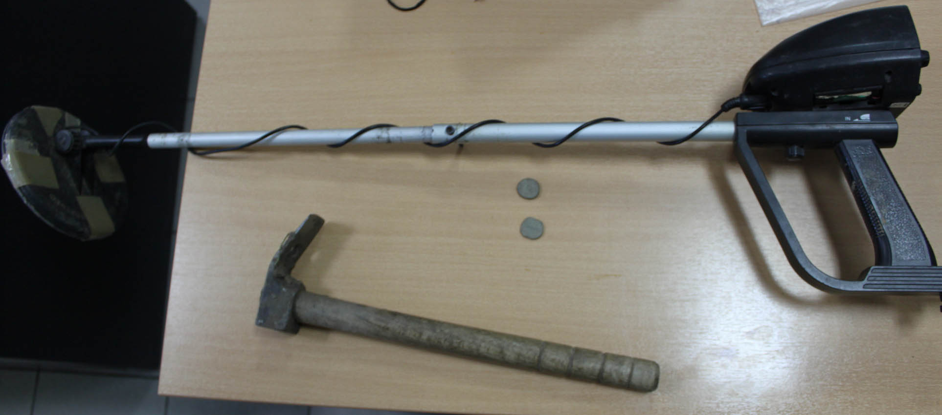 Στην κατοχή του 60χρονου, βρέθηκαν και κατασχέθηκαν 2 χάλκινα αρχαία νομίσματα, 1 ανιχνευτής μετάλλων και 1 σκαπτικό εργαλείο.