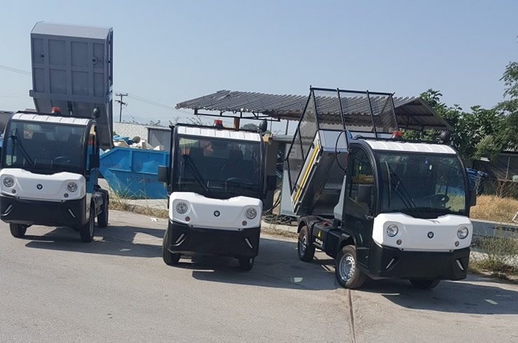 Συγκεκριμένα, πρόκειται για δύο τετράκυκλα ηλεκτροκίνητα οχήματα τύπου ανατρεπόμενου κάδου, ένα τετράκυκλο ηλεκτροκίνητο όχημα με ανατρεπόμενη κιβωτάμαξα και ένα τετράκυκλο ηλεκτροκίνητο όχημα με ανατρεπόμενη κιβωτάμαξα και πλυστικό μηχάνημα 200lt.