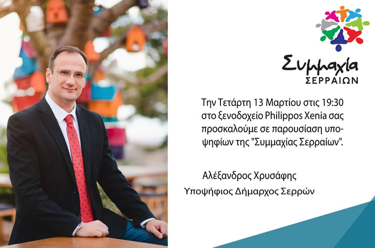 Σε νέα παρουσίαση υποψηφίων του συνδυασμού του θα προχωρήσει την ερχόμενη Τετάρτη 13 Μαρτίου ο επικεφαλής της «Συμμαχίας Σερραίων» κ. Αλέξανδρος Χρυσάφης. Η εκδήλωση θα πραγματοποιηθεί στο ξενοδοχείο Philippos Xenia, στις 7.30μ.μ.