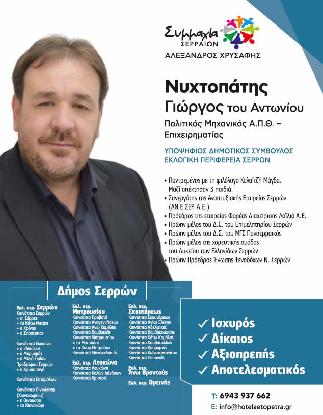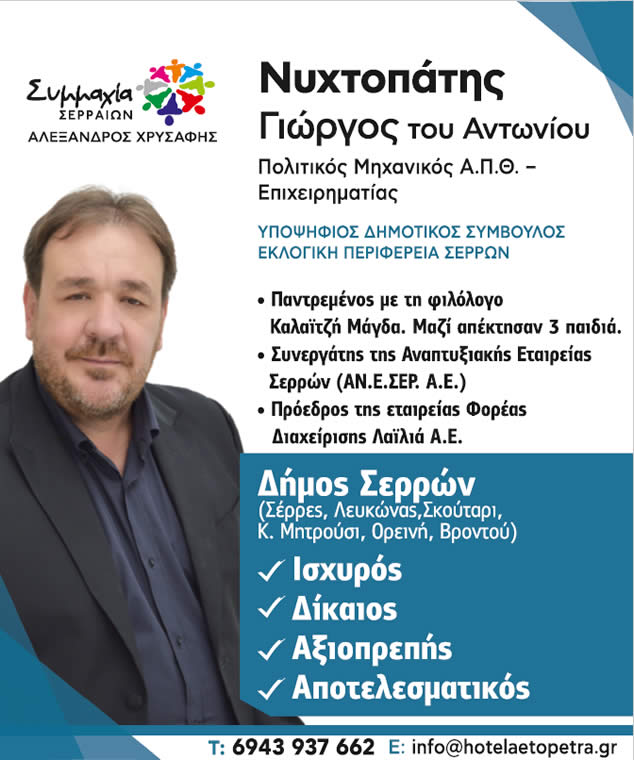 Πάντως, ο υποψήφιος δημοτικός σύμβουλος στο Δήμο Σερρών Γιώργος Νυχτοπάτης με τη Συμμαχία Σερραίων και τον Αλέξανδρο Χρυσάφη, κατάφερε να πρωτοτυπήσει, να γίνει viral και να κερδίσει την προσοχή με το προεκλογικό spot που του ταιριάζει άριστα, γιατί όσοι γνωρίζουν προσωπικά τον Γιώργο γνωρίζουν ότι είναι άνθρωπος με πολύ υπομονή και "κυνηγάει" να κάνει ότι περνάει από το χέρι του για το καλό του τόπου μας!