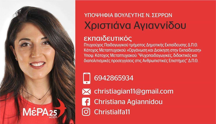 - To Ευχαριστήριο μήνυμα της Χριστιάνας Αγιαννίδου για τις εκλογές της 7ης Ιουλίου Το μήνυμα που έστειλε η Χριστιάνα μέσα από τον προσωπικό της λογαριασμό στο Facebook Σας ευχαριστώ όλους από καρδιάς για την ψήφο εμπιστοσύνης που δώσατε στο...
