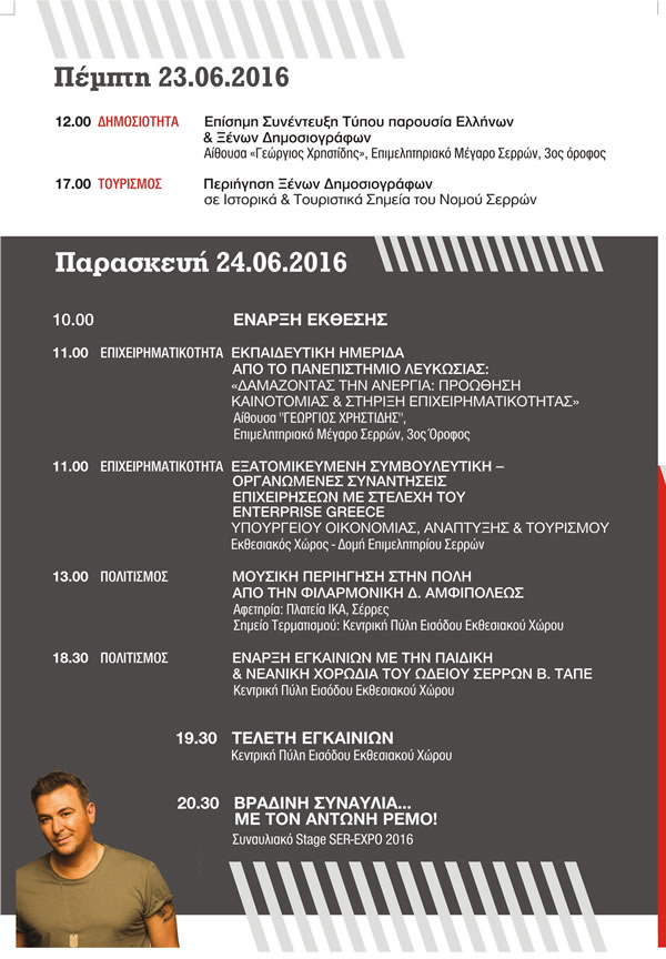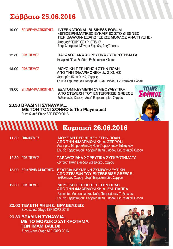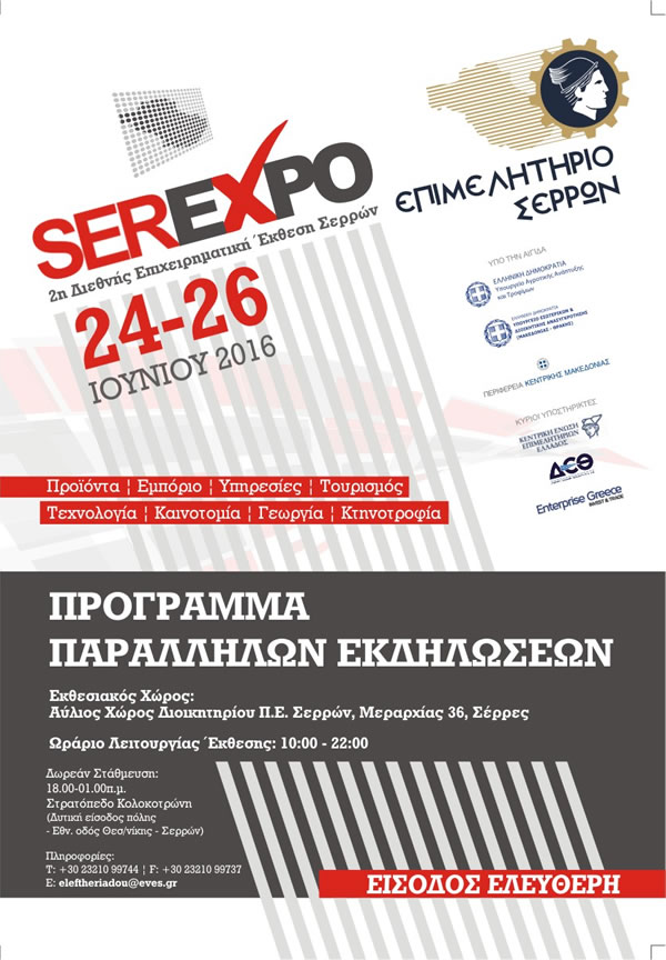 Πλούσιο πολιτισμικό πρόγραμμα θα έχουν την ευκαιρία να παρακολουθήσουν όσοι επισκεφθούν την Σερραϊκή εμπορική έκθεση SerExpo 2016 η οποία θα ανοίξει την πόρτα της το πρωί της Παρασκευής 24 Ιουνίου 2016.
