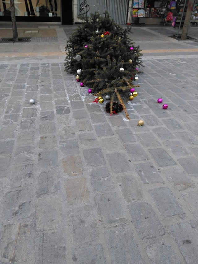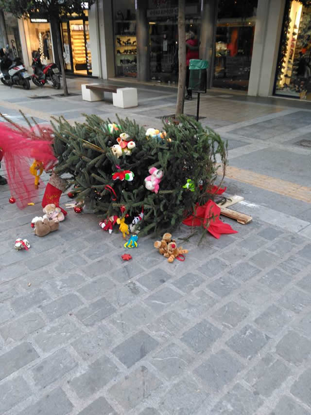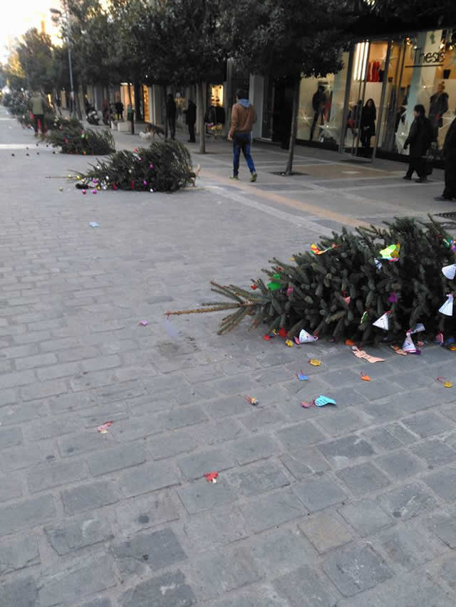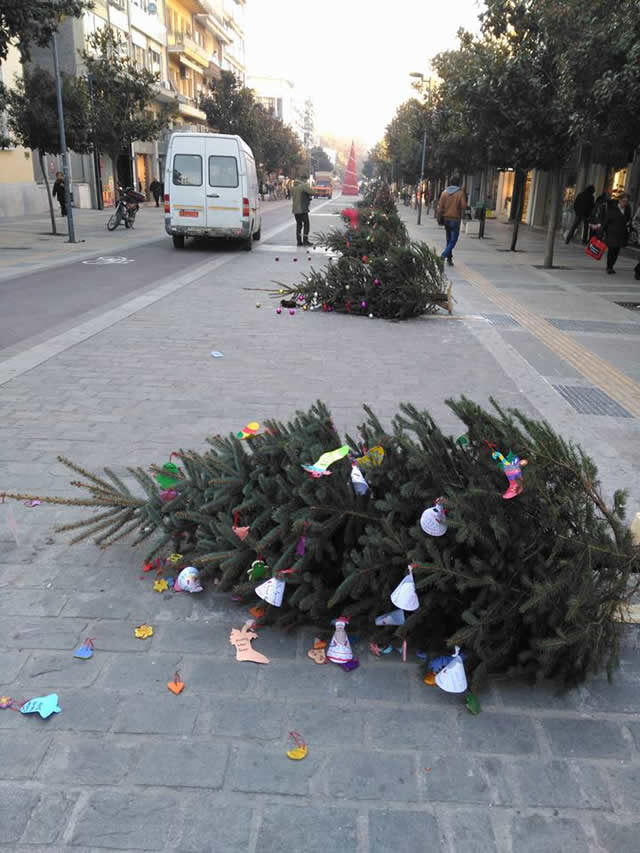 Οργή και αγανάκτηση προκάλεσε η εικόνα που αντίκρισαν το πρωί πολλοί συμπολίτες μας , στον πεζόδρομο της οδού Κ. Καραμανλή, όταν είδαν τα χριστουγεννιάτικα δένδρα που στόλισαν μαθητές των σχολείων ξηλωμένα κ πεταγμένα.