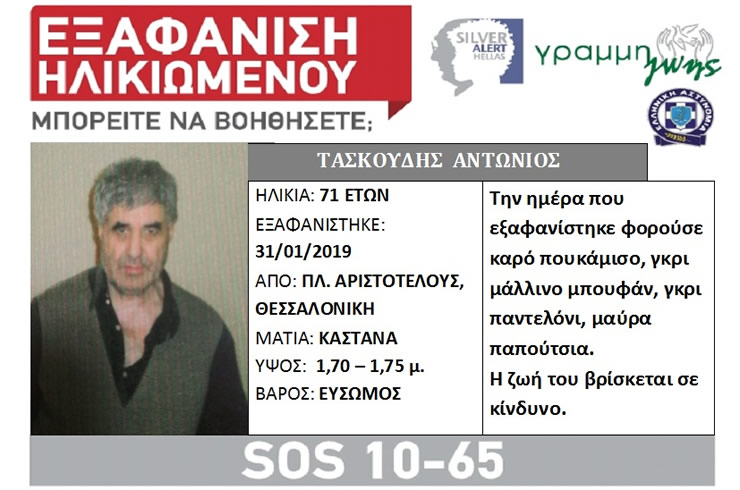 Ο Αντώνης Τασκούδης 71 χρόνων, με καταγωγή από τη Νικόκλεια Σερρών, αγνοείται από το μεσημέρι της Πέμπτης 31 Ιανουαρίου, από την πλατεία Αριστοτέλους.