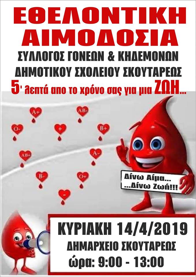 Μια από τις επόμενες δράσεις του πολύ δραστήριου Συλλόγου Γονέων και Κηδεμόνων Σκουτάρεως είναι και η αιμοδοσία που έχουν διοργανώσει για την Κυριακή 14 Απριλίου στο Δημαρχείο Σκουτάρεως
