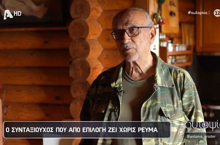 Ο κύριος Χάρης βγήκε στη σύνταξη πριν από 14 χρόνια κι έκτοτε αποφάσισε να τα παρατήσει όλα και να πάει στο δάσος, μαζί με τη σύζυγό του. Το σπίτι, βρίσκεται εκτός δικτύου ηλεκτροδότησης κι αυτό είναι ό,τι καλύτερο για τον κ. Χάρη. «Δεν το αντέχει η αισθητική μου να βλέπει καλώδια ΟΤΕ, ΔΕΗ και… μακαρονάδες στον ορίζοντα» λέει μιλώντας στην εκπομπή «Αυτοψία» του Alpha.